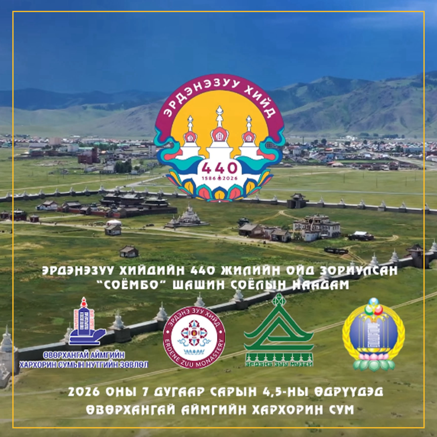 Монголын түүх, соёл, шашны нандин төв болсон "Эрдэнэ Зуу "хийдийн 440 жилийн ойд зориулсан “Соёмбо” шашин, соёлын наадамд та бүхнийг хүрэлцэн ирэхийг урьж байна.